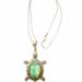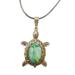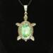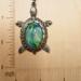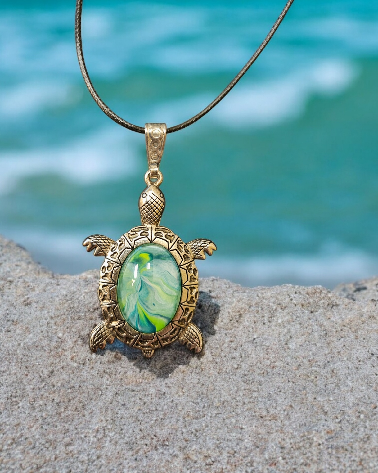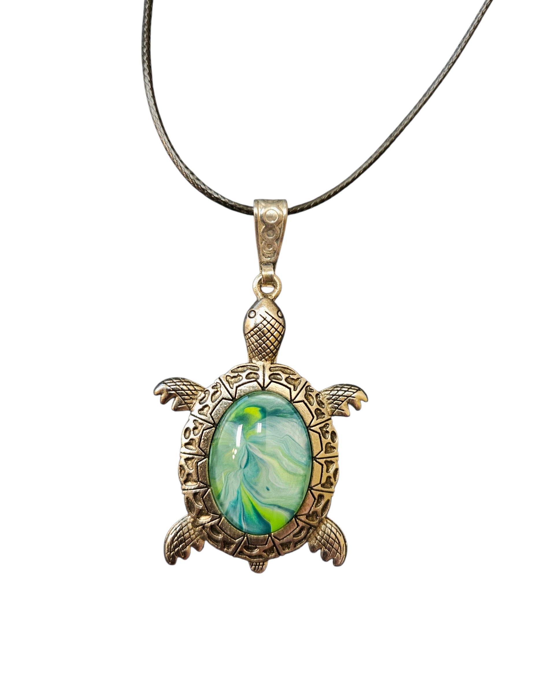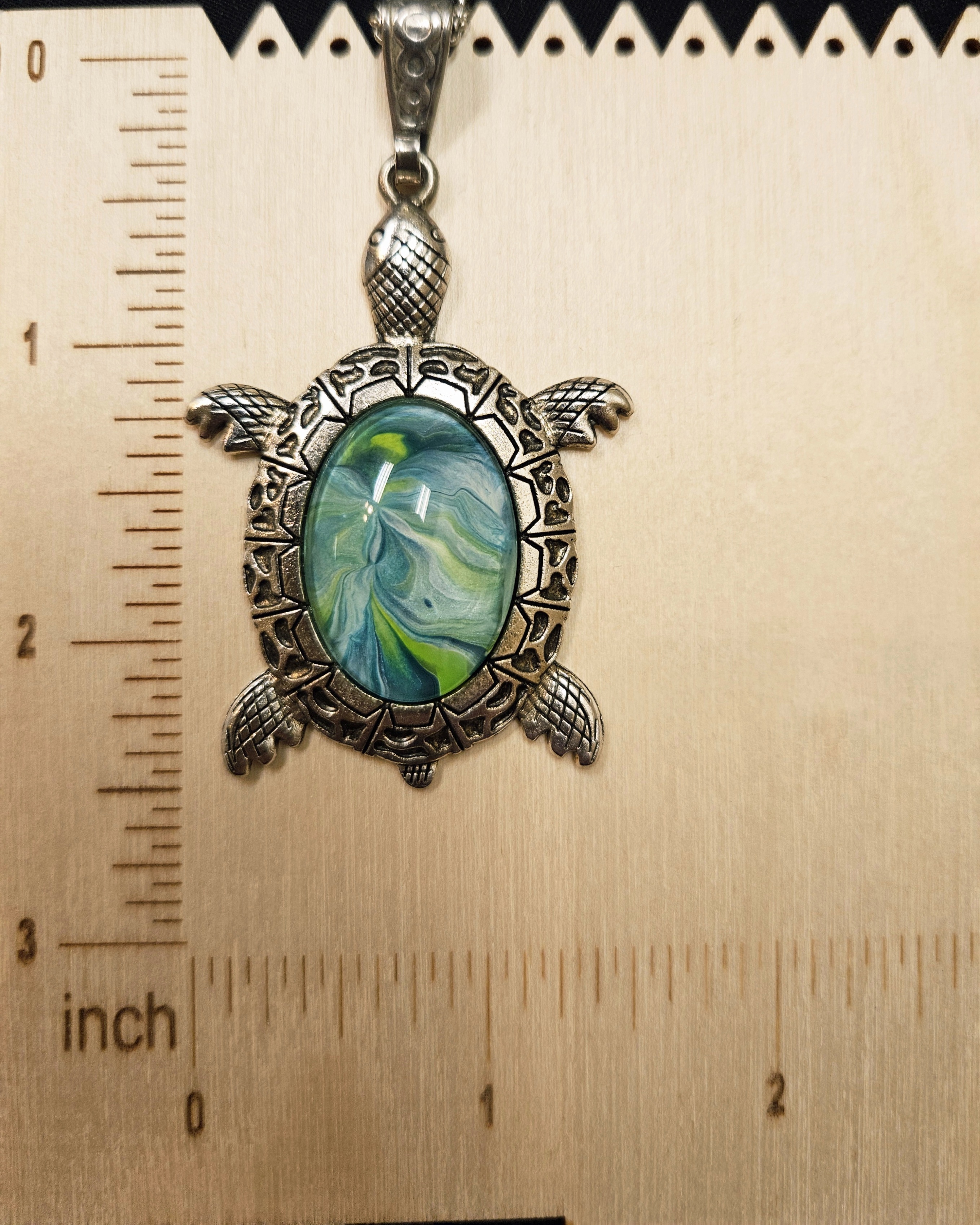 25mm oval glass center pour painted and set in a turtle shaped metal alloy base. Iridescent silver, yellow and greenish blue softly sit underneath the glass.