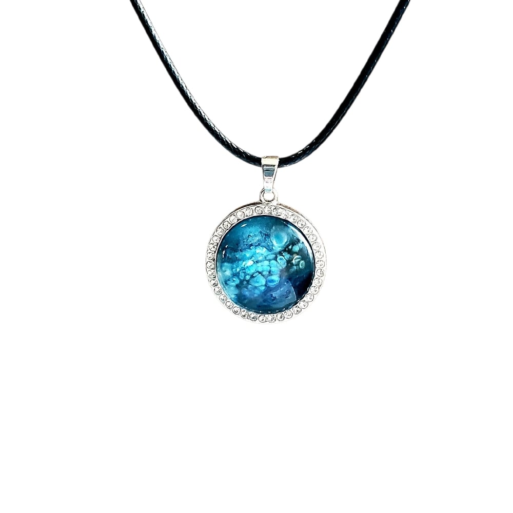 Embrace the depths of the ocean with this unique pour paint pendant with it's light and dark blue tones that look like bubbles.20mm round glass set in a zinc alloy base with rhinestones accent. Shades of blue pour painted, one of a kind.