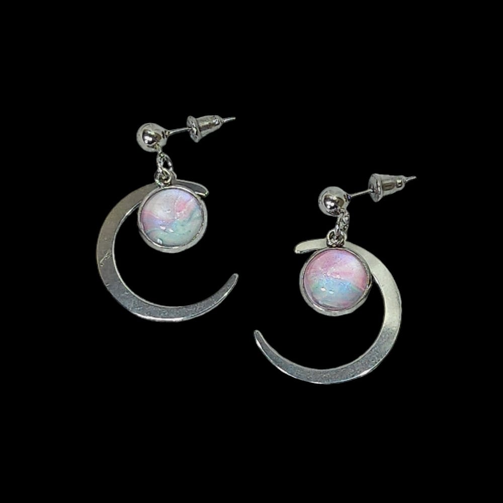 Product details: 10mm round glass pour painted and set in a half moon stainless steel setting. Hypoallergenic stainless steel. Colors may vary according to your screens and may be more vibrant in person.