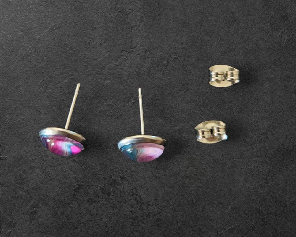 8mm pour painted glass center set in a hypoallergenic stainless steel stud earring set. Soft pink and blue waves of color dance under the glass. Great gift for birthdays and other special occasions for Fluid Art enthusiasts.
