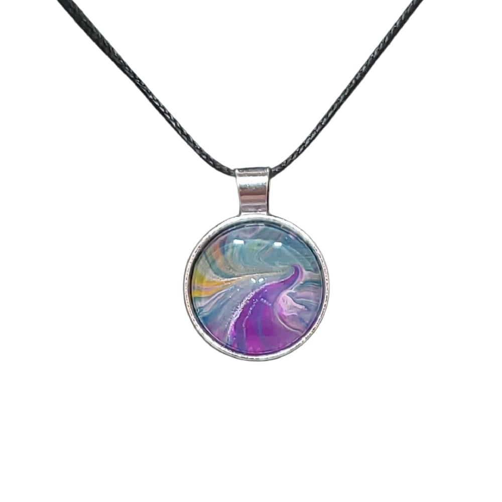 Introducing our Purple Road Pour Paint Pendant, a stunning piece of wearable art for the art enthusiast in your life! This unique necklace features a vibrant purple and blue landscape design, sure to make a statement wherever you go. Hand made and one of a kind, this pendant is a true work of art.
