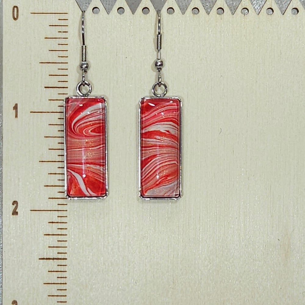 Elevate your style with our elegant pour painted earrings. Handmade and one of a kind, these unique earrings feature a stunning red and white marbled design.