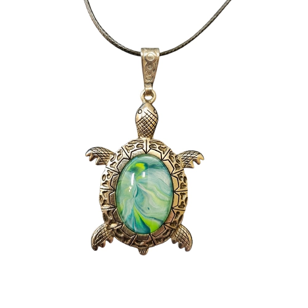 25mm oval glass center pour painted and set in a turtle shaped metal alloy base. Iridescent silver, yellow and greenish blue softly sit underneath the glass.