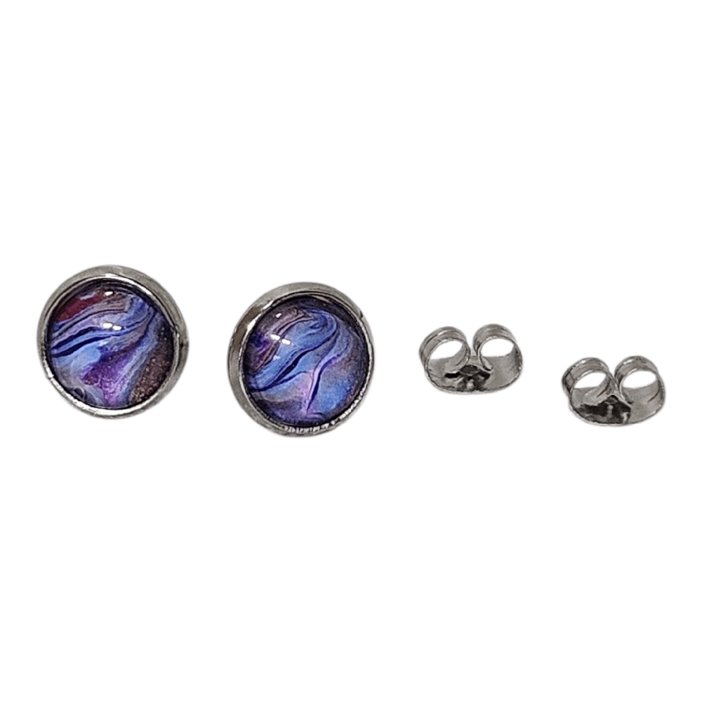 Make a splash with these unique stud earrings featuring a mesmerizing pour paint design in streaks of blue and purple with copper sparkles shimmering. Perfect for anyone looking to add a pop of color.